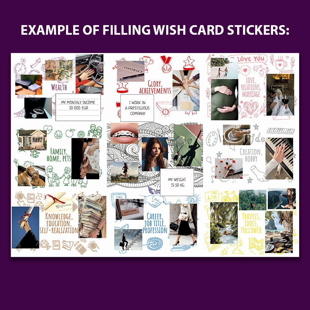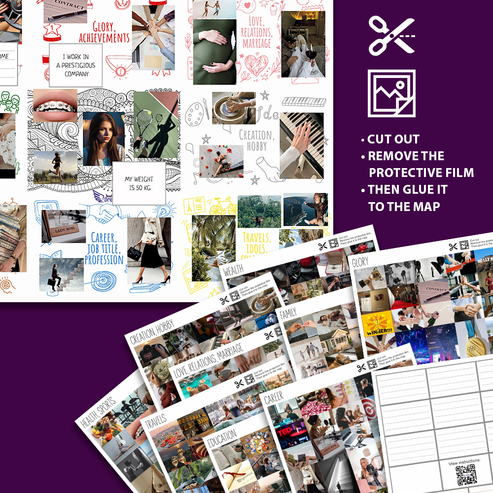 10 sheets of A4 self-adhesive stickers: more than 200 bright images that will help you visualize your goals. If there aren't enough images, there is a whole sheet with stickers for writing.